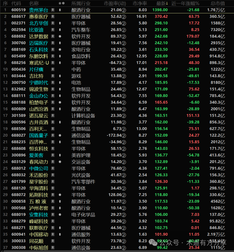 除了贵州茅台,全部集中在高科技制造领域。