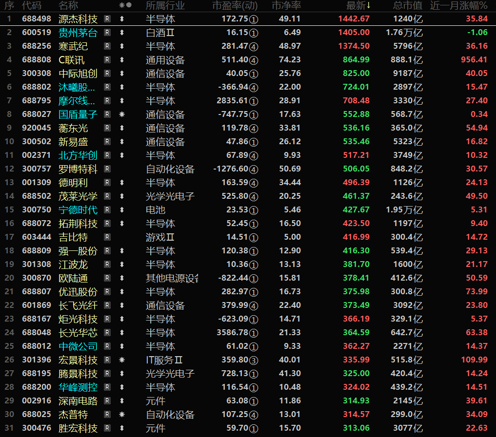 截至今日股价超过1000的股票有三只,分别是源杰科技1442元、贵州茅台1405元、寒武纪1374元。